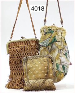 Konv.3 Jugendstil-Damentaschen, Stoff teilw. mit Perlen bestickt, floral, ausgearbeitete Taschenbügel, Silber sowie Messingarbeit, ausgef., 17 cm bis 22 cm