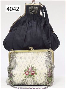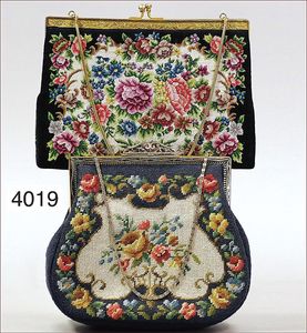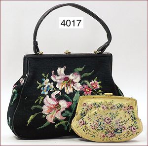Konv. Petit Point, schwarze Damentasche mit gestricktem Blumendekor, vorne sowie hinten, Ledertrageriermen, goldener Klappverschluss oben, Innenfutter Seide, 2 Seitentasche, 34 cm breit, 26 cm hoch, dazu Jugendstiltasche, florales gesticktes Motiv, vorne sowie hinten, Innen alte rosefarbene Seide, Tragekette fehlt, 20 cm breit, 14 cm hoch