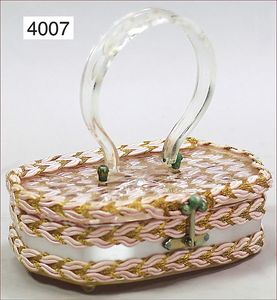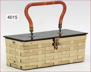 Doll Set, Fith Avenue, 50er Jahre, Plastic Bag, Kunststoffdeckel, bernsteinfarbener Trageriemen, vergoldete Beschläge, Messingblech geflochtenes Gehäuse, innen altrosé Seide, Seitentasche mit Verschluss, 22,5 cm breit, 8 cm hoch, 10 cm tief, ausgef., sehr guter Zust.