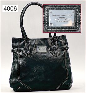 TOMMY HILFIGER American Classica, Est. 1985, schwarzes, weiches Leder, abgesteppte Nähte, beiger Magnetdruckknopf, 2 Leder-Trageriemen, Innenfutter Stoff, rot abgenäht, 2 Seitentaschen, 1 Reißverschluss, 31 cm hoch, 40 cm breit, minimale Gebrauchsspuren