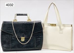 Konv. 2 ausgef. Damentaschen, 40er Jahre, gr. eckige Tasche, weißes Leder, 36 cm breit, 24 cm hoch, 2 Trageriemen, vergoldeter Messingverschluss, Innen beige, Seitentasche, 36 cm, 24 cm hoch, dazu schwarze Ledertasche, Lack, Krokooptik, massiver Messingtragegriff, Innenfutter Stoff, 39 cm breit, 27 cm hoch, langer Kettenschulterriemen, Abnutzungsstellen an den Kanten