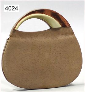 60er Jahre, Damen-Abendtasche, ausgef. Schnittform, Kupfer/Bein, Innenfutter Seide, beige mit altem Spiegel, Tragebügel, 2 Seitentaschen, rosefarbenes Leder