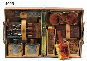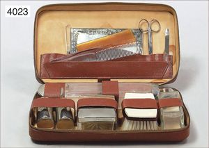 ausgef. Reiseset (Lederkoffer), ca. 50er bis 60er Jahre, 2 Parfumflakons, Glas geschliffen, bernsteinfarbene Kunststoffdeckel, Nagelset mit bernsteinfarbenen Griffen, 2 Puderdosen, 2 Bürsten, Kamm, Seifenschale, vollständig, ausgefallen, 30 cm breit, 23 cm hoch, 12 cm tief, Sammlerstück