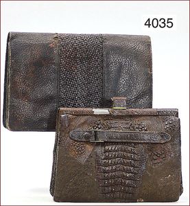 Konv. 2 Taschen, 1 x 30er Jahre, Damen-Handtasche, mit Klappverschluß, Innenfutter Seide, mittig Portemonnaie, Innnefutter ausgebessert 20 cm breit, 16 cm hoch, dazu 1 flache Damenhandtasche, Druckknopf, Innenfutter weiches glattes Leder, 4 Fülltaschen, mittig Portemonnaie, mit Druckknopf, 22 cm x 15 cm