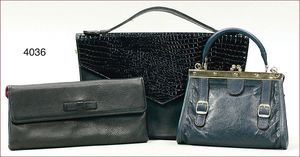 ausgef. Konv. Vintage Damentaschen, 1 x Clutsch, anthrazitfarbenes Leder, Innenfutter bordeauxrote Seide, Seitentäschchen, Messingbeschlag, Druckknopf, 27 cm breit, 12 cm hoch, dazu schwarze Tasche, weiches Leder, 26 cm breit, 20 cm hoch, Trageriemen, Frontseite Lack, Innenfutter Stoff, seitl. Kunststoffreißverschluss, gr. Fülltasche, leichte Gebrauchsspuren, 1 x Tasche, dunkelblaues Leder, Messingbeschläge, 1 Trageriemen, innen Stoff, gr. Fülltasche, 15 cm x 20 cm