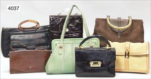 Konv. Damentaschen, untersch. Alters, u. a. mintfarbene Damentasche mit Reißverschluss, u. a. Lacktasche, 1 gr. Wildleder-Damenhandtasche, ca. 30er Jahre, Innenfutter Seide, 7 Teile