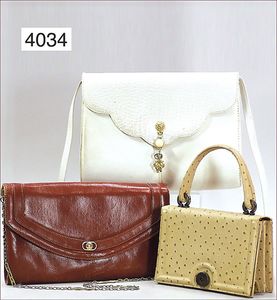 Konv. 3 Damenhandtaschen, 70er Jahre, karamelbraun, langer Kettenriemen, vorne Druckknopf, Innenfutter Stoff, seitl. Reißverschluss, 29 cm breit, 19 cm hoch, 1 Damentasche, Straußenleder, Metallreißverschluss, 1 Trageriemen, eckige Form, 20 cm x 15 cm, dazu 1 weiße Damenhandtasche, ausgef. Verschluß, mit 3 Anhängern, weiß, weiches Kalbsleder, 1 Trageriemen, Magnetknopf, Innenfutter weißes Leder, 29 cm breit, 20 cm hoch, leichte Abnutzungsspuren