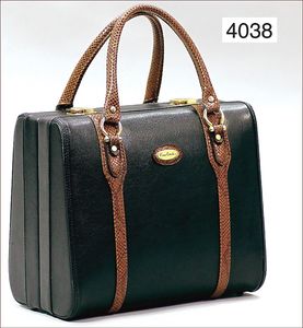 PIERRÈ CARDIN Handkoffer, 2 Trageriemen, mit golfarbenen Ringbeschlägen, auf der Vorderseite mit Emblem, oben Verschluss, innen 3 große Fülltaschen, mittig Plastikreißverschluss, seitl. 4 Schlaufen, 28 cm hoch, 18 cm tief, 32 cm breit, sehr schöner Orig.-Zust., unten 4 Füße