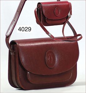 CARTIER Must de Cartier, Damentasche, ca. 1970, langer Schulter-Leder-Trageriemen, größenverstellbar, silberne Beschläge, bordeaux-rotes weiches Leder, Magnetknopf-Verschluss, innen Emblem Must de Cartier Paris, silber, 3 große Füll-Fächer, 2 Seiten-Taschen, 1 x mit Reisverschluss, 25 cm breit, 18 cm hoch, im Orig.-Aufbewahrungssäckchen, unberührter Zust.