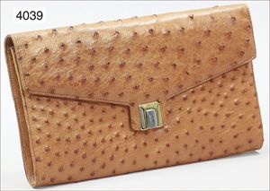 Clutch, Straußenleder-Tasche, cognac-farben, vergoldeter Verschluss auf der Vorderseite, Innenfutter weiches cognac-farbenes Leder, Cap Cobra, Fülltasche, seitl. Tasche mit Plastik-Reißverschluss