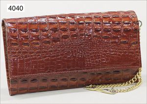 Damenportmonaie, cognac-farbenes Krokodil-Leder, lackiert, Innenfutter Wildleder, 2 große Fülltaschen, mittig Tasche für Kleingeld, Druckknopf, 18 cm breit, 11 cm hoch, Kette für Handgelenk, kleinere Abnutzungsstellen, sonst schöner Orig.-Zust.