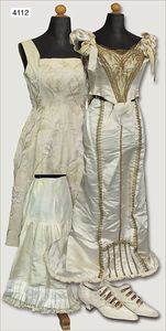 herrschaftliches Damenkleid, cremefarben, Seide mit floralem Muster bestickt, Metallreißverschluss hinten, mit Unterrock mit Spitze, Korsage mit Metalldraht vorne und hinten, passender Rock, herrschaftlich ausgearbeitet, dazu passend ein paar Damenschuhe ca. 1920, cremefarben, schönes Konv.