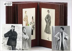 Modellzeichnungen von Otto Krumpholz, Aquarell, Entwürfe für Damenkleider, 43 cm breit, 46 cm hoch, 11 cm tief, Modezeichnung der 30er-50er Jahre, ca. 15 Aquarellzeichnungen, ausgef., beiliegend schwarz/weiß Fotografien, Damen mit ausgef. Pelzmäntel