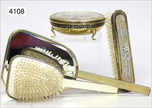 Frisierset, Messingbelch vergoldet, Haarbürste, Spiegel, Puderdose, mit Quaste und Spiegel, 1 Bürste, 29 cm - 11 cm
