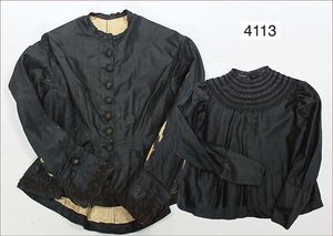 Konv. Herrenjacke im Rokoko-Stil schwarze Seide, kl. Stehkragen, links Knopfreihe, Seide leicht verschlissen, feine Spitze an den Ärmeln und am Kragen, dazu Damenbluse und Jacke