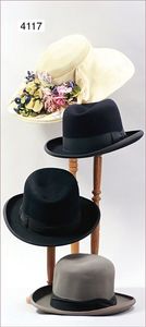 Hutschachtel, 41 cm Durchm., 1 Damenhut mit reichh. Blumendekor, 1 x gemarkt A. Reiter, München, Der Hutmacher am Dom, mit Ledereinsatz, innen Seide, wohl 30/50er Jahre, ausgef., dazu 3 Männerhüte