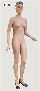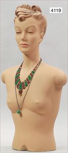 Schaufensterpuppe, wohl 40er Jahre, ausmodellierte lockige Kurzhaarfrisur, fein geschwungene Augenbrauen, gemalte Augen, aufgeklebte Wimpern, Finger an kl. Stellen bestoßen, sowie etwas ausgebessert, Masseabplatzer an der li. Poseite, anmodellierte schwarze Pumps, 1,80 m groß, extrem ausdrucksstarkes Gesicht