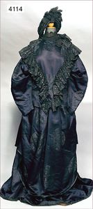 2-teiliges herrschaftliches Damenkleid, marineblau, Seide, mit orientalischem Muster verziert, Spitzen nachträglich ergänzt, Unterrock Seide, verschlissen, alte Metallhaken-Verschlüsse, ca. Gr. 38, dazu schwarze Spitzenhaube, ausgefallen