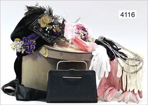 alte Hutschachtel, 28 cm Durchm., mit Damen-Accessoires, Leder-Handschuhe, Federschmuck, Spitzenhandschuhe, 1 Hut, prächtig gearbeitet, Samt mit Perlenschmuck