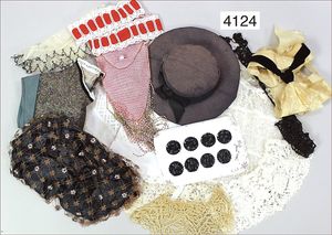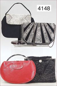 Konv. Damen-Abendtaschen, untersch. Zeit, 1 Stofftasche, Perlen besetzt, wohl 30er Jahre, dazu Samttasche mit Silberpailetten, gr. Ledertasche, Seidentasche, schönes Konv.