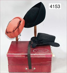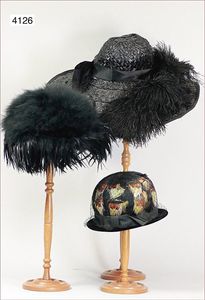 Konv. Damenhüte, 1 x mit Federn, Melonenform, dazu ausgef. Federhut, schwarz, unberührter Zust.,1 prächtiger schwarzer Stohhut, bestickt mit Federn und Seidenschleife, ca. 20/30er Jahre