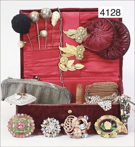 Schmuckschatulle, brombeerfarben, Samt, Messingblech vergoldet Embleme, seitl. sowie am Deckel, teilw. etwas berieben, reichh. Modeschmuck, sowie Silberkettentasche, Broschen, Anhänger, Federschmuck, ausgef.