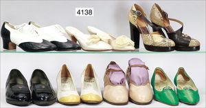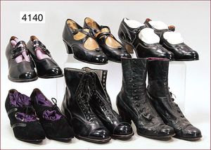 6 Paar Damenschuhe, ca. 20er-30er Jahre, u. a. 1 Paar Lederstiefeletten, seitl. Knopfreihe, ausgef.