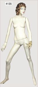 Schaufensterpuppe, 30er Jahre, ausmodellierte, lockige Frisur, gemalte blaue Augen, rote Lippen, ausgef. Körperhaltung, Rissbildung an den Händen, 1 Hand ergänzt sowie kl. Abplatzer am Körper, 1,80 m groß