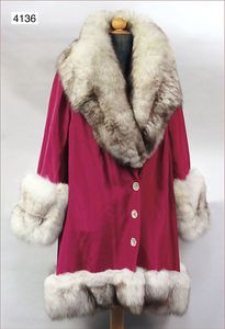 ausgef. fuchsiafarbener Mantel, 60er Jahre, ca. Gr. 38, Schulterpolster, 3 gr. Perlmutt-Knöpfe mit breitem sehr gut erhaltenem Pelzkragen, sowie Pelz an Ärmel- und Mantelsaum, knielang, ausgef.