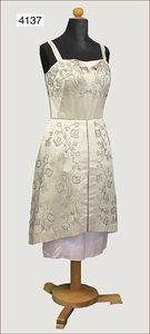 60er Jahre Damen-Seidenkleid, ca. Gr. 38, Metallreißverschluss hinten, 6 Druckknöpfe mit floralem Perlmuster bestickt, leichter V-Ausschnitt, darunter zartrosa Seideneinsatz, sowie gr. Schlitz mittig, passender rosa Seidenrock, schöner Zust.