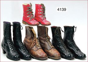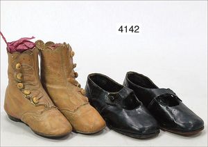 ausgef. Kinderschuhe oder für gr. Puppe, Leder-Stiefelette, gehämmerter Absatz, seitl. Knopfreihe, 12 cm lang, kl. Pfennigabsatz, dazu 1 Paar schwarze Lackschuhe, Gr. 22 cm, ausgef.