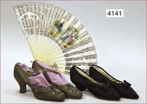 2 Paar Damenschuhe, ca. 1930, Seidenbezug, teilw. verschlissen, Perlen bestickt, dazu ausgef, Damenfächer, filigrane Beinarbeit, mit integriertem Spiegel, handkoloriertes Jugenstilmotiv, ausgef.
