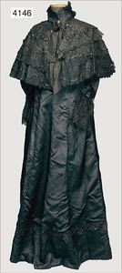 schwarzes Hochzeitskleid ca. 1930, weit gearbeitet, an den Ärmelenden Rüschen, Seide, Ornamente am Kragen und Dekoltee, dazu passend Cape mit Pailetten und Perlenbesatz, reichhaltig Rüschen, Stehkragen, Hakenverschluss