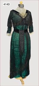 Art Deco, ausgef. Damenkleid, V-Ausschnitt, Spitzenkragen, grüne Seide, darüber Perlenarbeit, alte Hakenverschlüsse, passender Gürtel, schöner Orig.-Zust., ausgef.