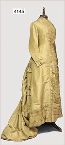 Damenkleid ca. 1920, beige, schmal geschnitten, Knopfreihe vorne, Seide, lange Schleppe hinten, Rüschenornamente vorne und hinten, Büstenhöhe 1,70 m, altersbed. Farbabweichungen am Ende der Schleppe, fein gearbeitet, 1 Knopf fehlt, Seitentasche an der Hüfte, leichter Stehkragen