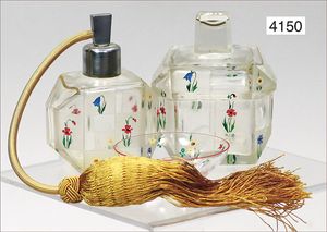 Konv. 40er Jahre, Damen-Kormetikset, 1 x Glas-Parfumflacon, mit floralem Dekor, Zerstäuber intakt, 11 cm hoch, dazu Glasgefäß mit Deckel, florales Dekor, 12 cm hoch, Chip seitl., kl. Schüssel, 8,5 cm Durchm.