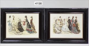 Konv. 2 handkolorierte Biedermeierdrucke, Darstellungen 2 herrschaftl. Damen mit pompösen Kleidern, Il Mondo elegante, Nr. 45, 6. Novembre, 1876, leicht ausgeblichen, herrschaftl. Kleidung, 37 cm hoch, 27 cm breit, im Holzrahmen, fein geschnitzt, dazu Nr. 41, 9 Oktober 1876