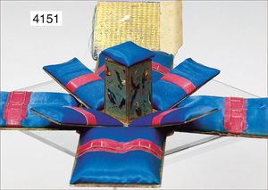 BIEDERMEIER aufklappbares Nadelkissen, außen mit lithogr. Papier beklebt, Deckel aus gepolsteter blauer Seide, innen mit Geheimfach, 13 cm