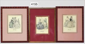 Konv. handkolorierte Damendrucke, Modes de Paris, 1840, J. Sürchse, Darstellungen von Pompösen Kleidungen, 1839-1840/Lemiroir, 3 Stück, in Holzrahmen, 23 cm hoch, 17 cm breit, ausgef.