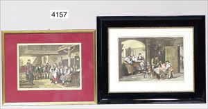 Konv. 2 Teile, handkolorierter Druck, Familienszene nach einem Gemälde von Hugo Engl. R. Brend´amour X.A., München, Kinder im Holzwagen, bäuerliche Szene, dazu Gemälde von B. Dautier, Kinderszene in Kirche, Handkoloriert