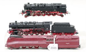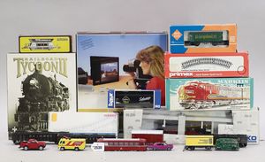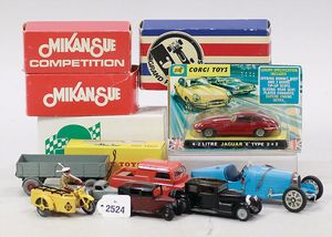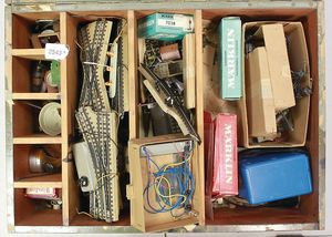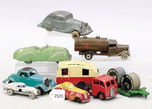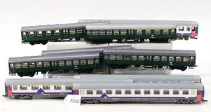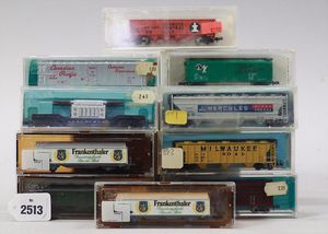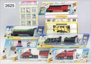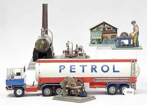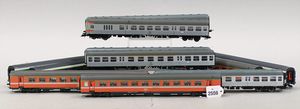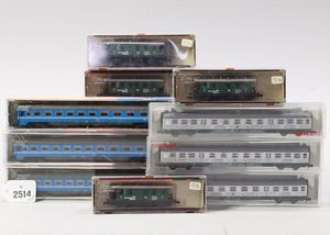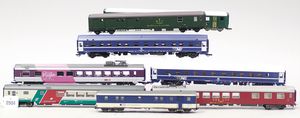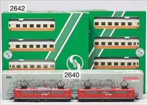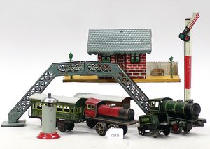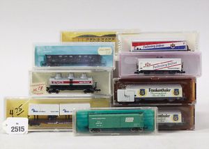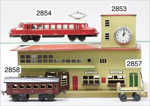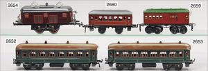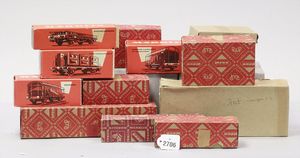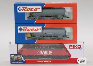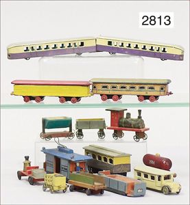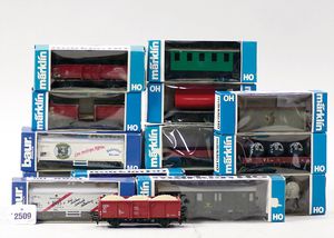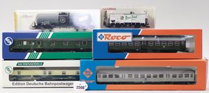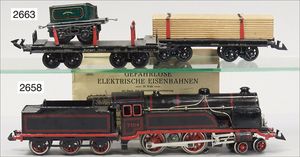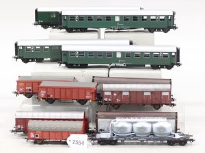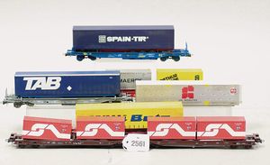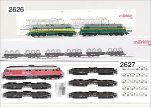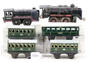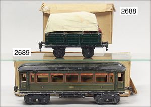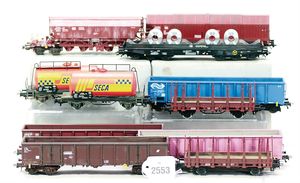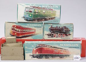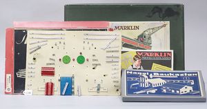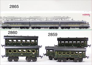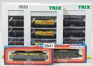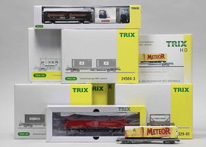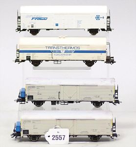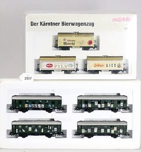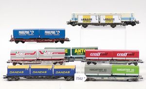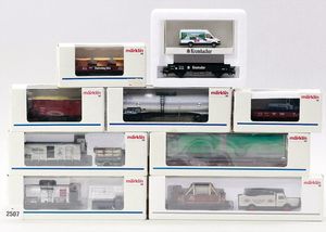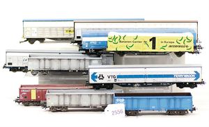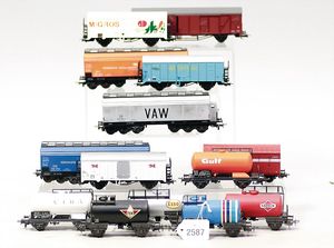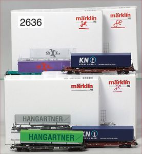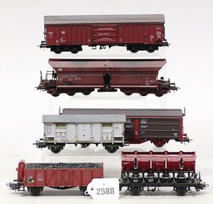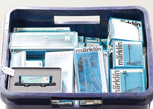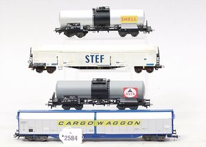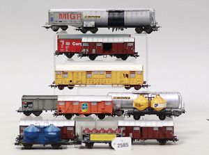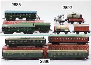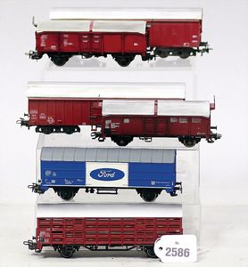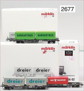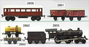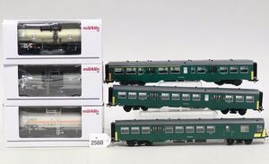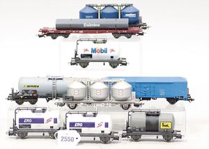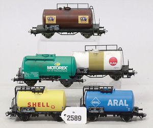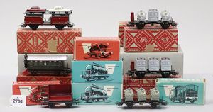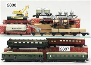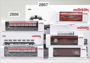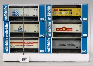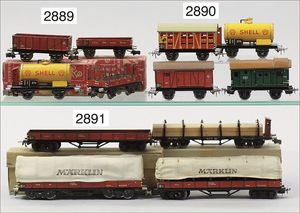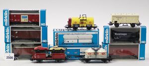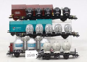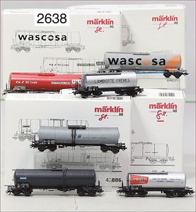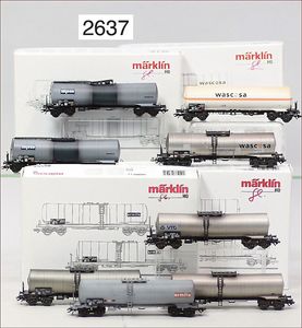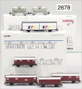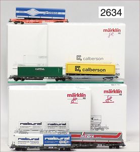 MÄRKLIN H0, Güterwagen, Blech, 374, Tankwagen, silberne Klauenkupplung, Einfederblatt, 365, Hochbordwagen, braune Klauenkupplung, Einfederblatt, 364, Niederbordwagen, braune Klauenkupplung, Einfederblatt, 372, braune Klauenkupplung, Einfederblatt, dazu 2 Märklin-Kart., nicht zu den Wagen passend, sehr guter Zust.