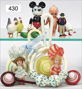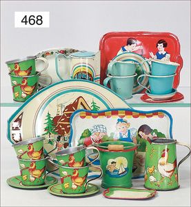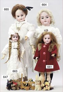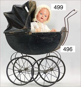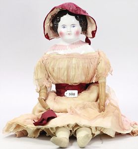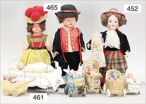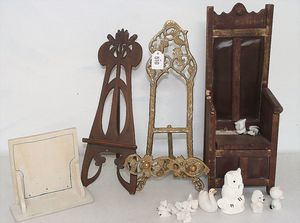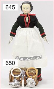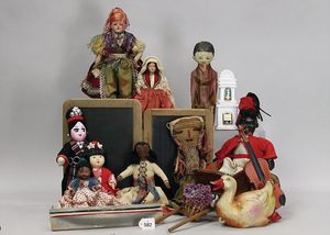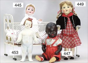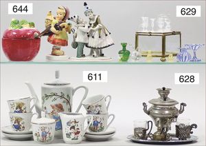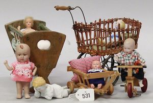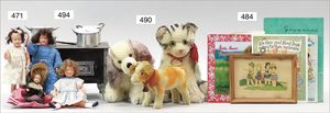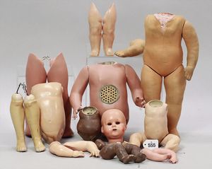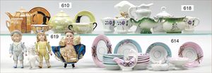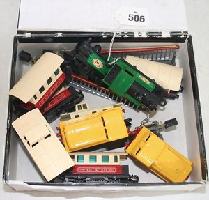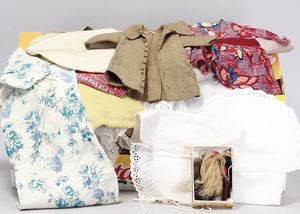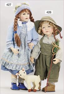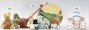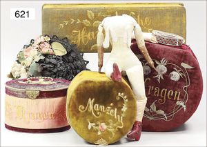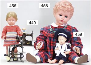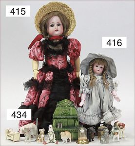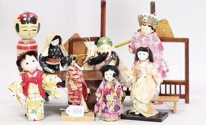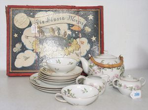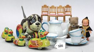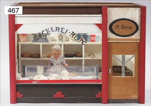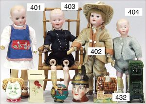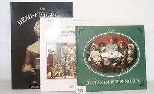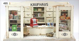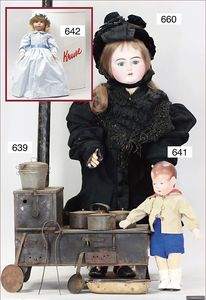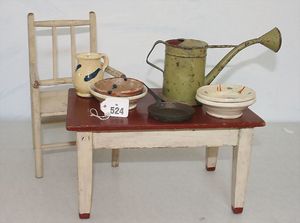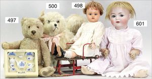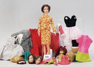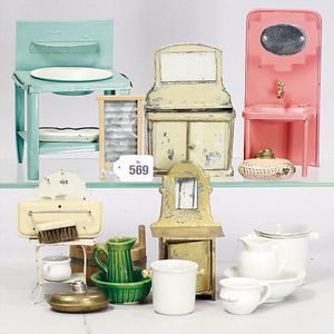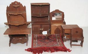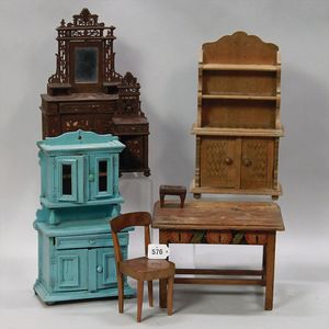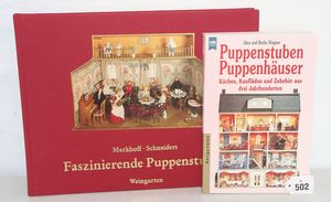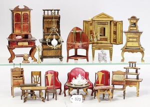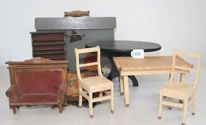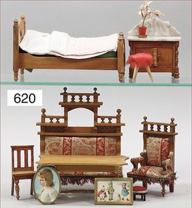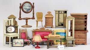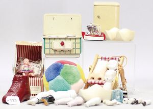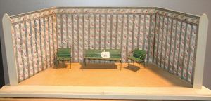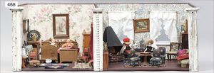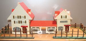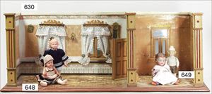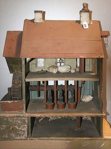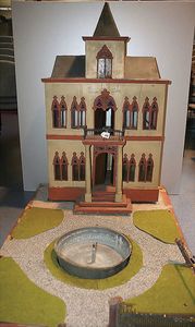 Puppenhaus, 2-stöckig, mit Turm, Höhe ca. 105 cm, Länge 60 cm, Tiefe 26 cm, mit verglasten Fenstern, Balkon, Eingangsportal, mit 2 Säulen, mit einigen Kleinteilen Mobiliar, Wohnzimmercouch, mit 5 Sesseln, 3 Stühle, kleiner Tisch, dazu 1 große Bodenplatte (herrschaftlicher Garten), mit einem eingelassenen Blech-Brunnen, mit Wasseranschluss, alles stärker bespielt, kleinere Teile weggebrochen