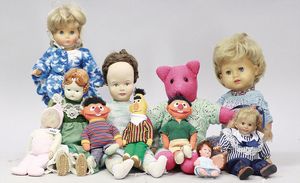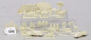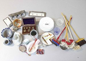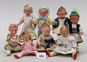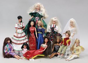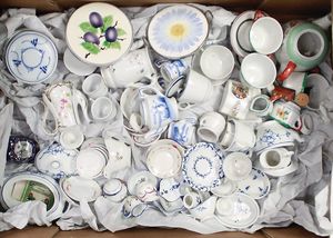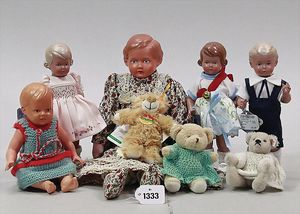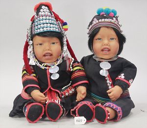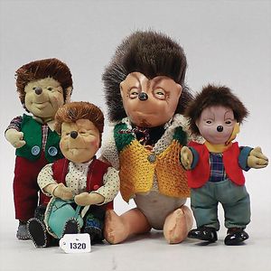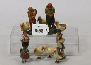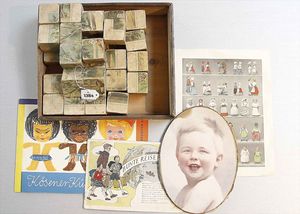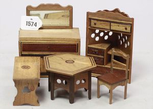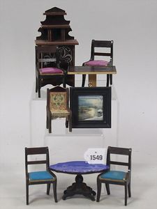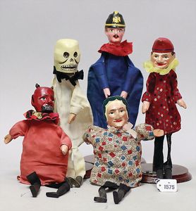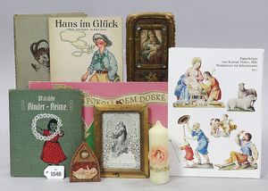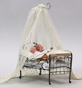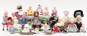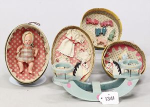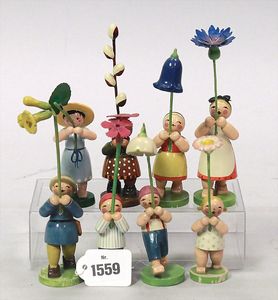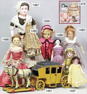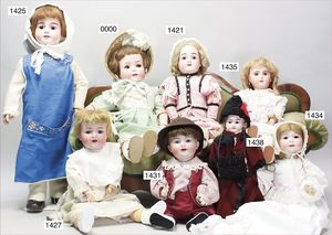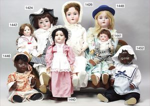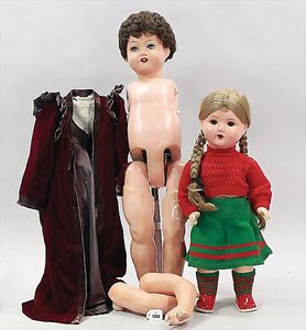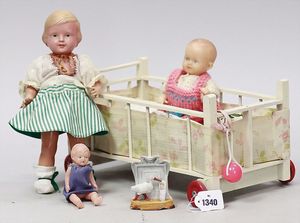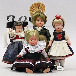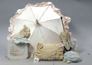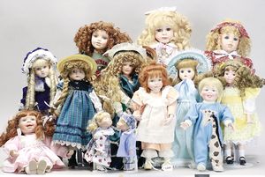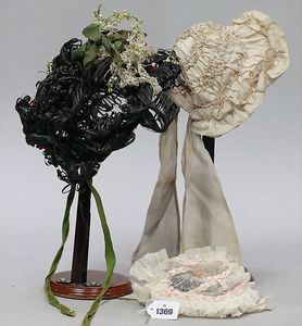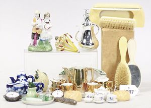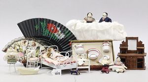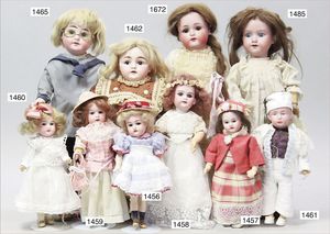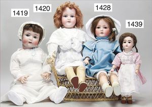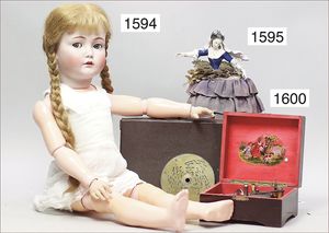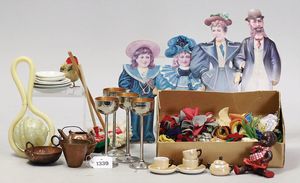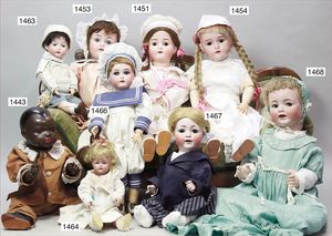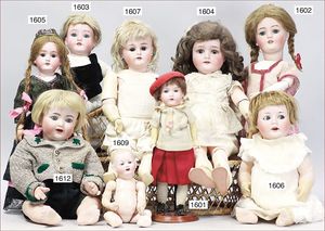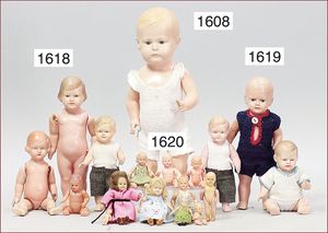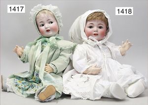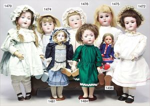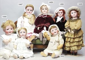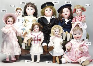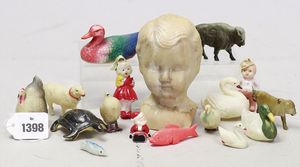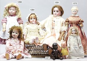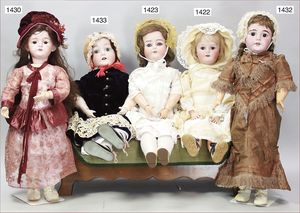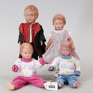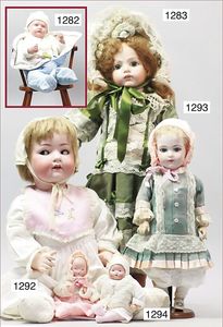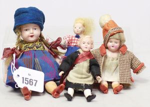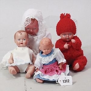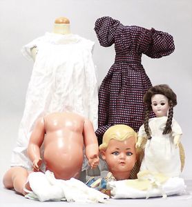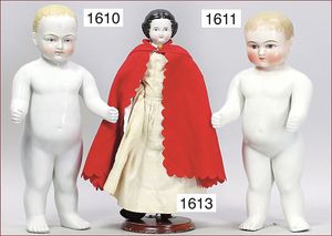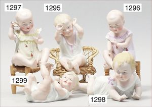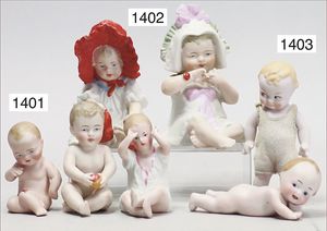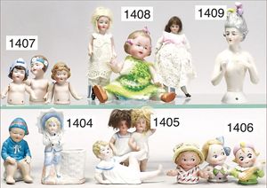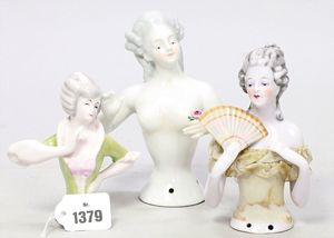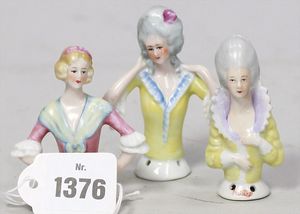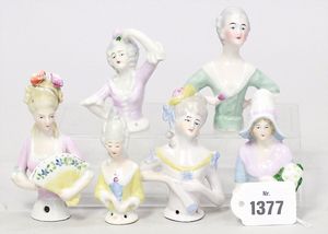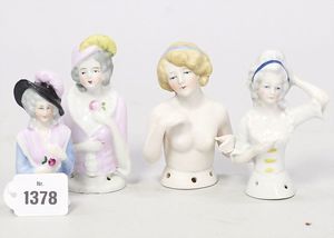 4 Halbpuppen, Biskuitporzellan, 1 x davon glasiert, fein ausmodellierter Hut und Federn, Rosenblüte, 10 cm, 1 x mit fein ausmodellierten Haaren, Haarreif, untersch. Handhaltung, 8 cm dazu Halbpuppen, Biskuitporzellan, glasiert, fein ausmodellierte Frisuren mit Haarreif, Hut und Feder, untersch. Handhaltungen, 1 x gemarkt 1680, 1 x gemarkt Germany 347, 8 cm bis 9 cm