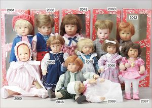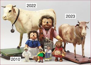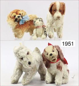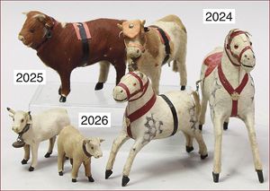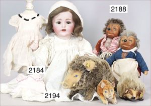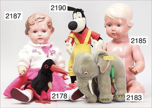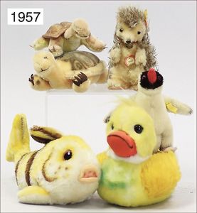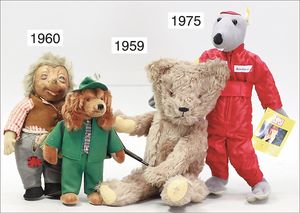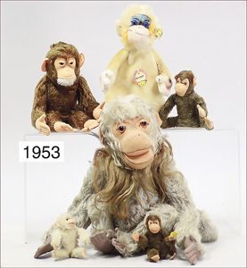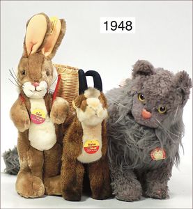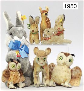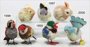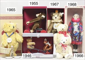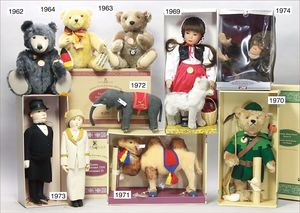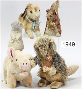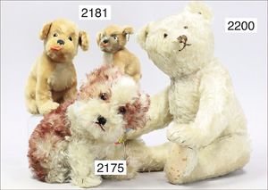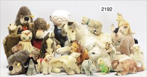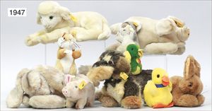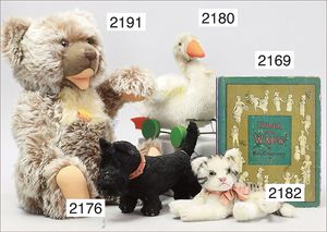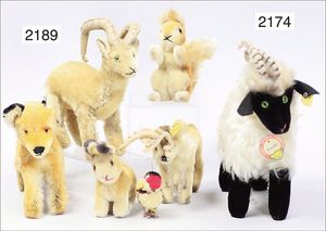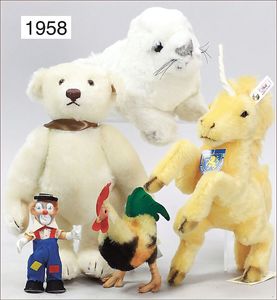 STEIFF Konv. Replika, Bär, weiß, dunkle Nasenbestickung, mit Knopf, weiße Fahne, Porzellan-Brustemblem, Aufschrift 1847, Kindheitsträume leben weiter, 1997, 30 cm, Robbe, mit Knopf und gelber Fahne, weich gestopf, 30 cm, Einhorn, Margarete Steiff GmbH, 1995, komplett, 1 Hahn, Stehhöhe 18 cm, Filz in gutem Zust., Clowni 12 cm, ca. 1950, Stoffkleidung in guten Zust., unbespielt, bitte besichtigen