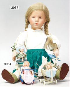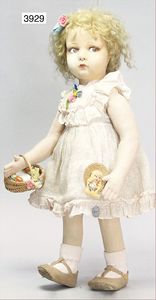 KÄTHE KRUSE Dt. Kind, Mädchen, Stoffkopf, deutl. sichtbare Hintekopfnaht, leicht eingeknickte Beine, abgenähte Kniekehlen, Augenbrauen leicht abgegriffen, sonst schöner Orig.-Zust.