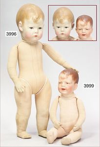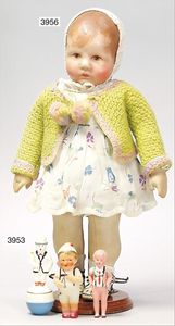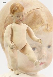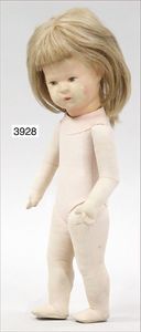 KÄTHE KRUSE Puppe Nr. 2, Froschhand, Kopftyp der 2. Variante der Puppe Nr.1, mit gewachstem Körper, Stoff am Nacken gewachst (es handelt sich hierbei wohl um eine Übergangsvariante), 44 cm, Stoffkopf, 3 Hinterkopfnähte, breite Hüfte, breite Hand, Stoff in der Beinscheibe möglicherweise 1x ergänzt, alte Arbeit, schöne dünne Bemalung, guter Zust., selten