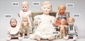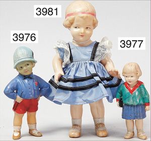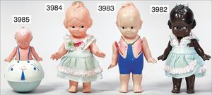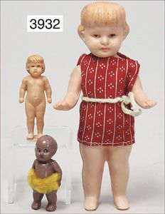 SCHILDKRÖT Steifbein-Puppe, SoR, 13 cm, fein ausmodellierte Haare, gemalte Augen, bewegl. Arme, feste Beine, kl. Steifbein-Puppe, Minerva, 5,5 cm, kl. farbiges Kind, Celluloid