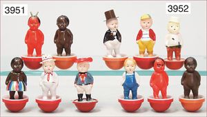 Paul Müller 5 Teile Celluloid, Stehauf-Figuren, 7 cm, Teufel, 2 farbige Figuren, 2 Jungen, guter Zust.