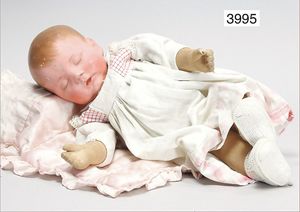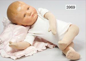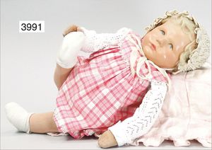 KÄTHE KRUSE Träumerchen, 45 cm, Magnesitkopf, beschwert, Trikotkörper, Poloch, Bauchnabel, bespielt, 1 Daumen berieben, kleinere Lackabplatzer in der Gesichtsbemalung