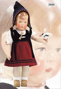 CELLBA Gretchen, 28 cm, Celluloid, fester Kopf, blaue fest eingesetzte Glasaugen, bewegl. Arme und Beine, unbespielter Orig.-Zust., alte Gummibänder, Orig.-Kleidung, mit Schild, selten in dieser Ausführung (Glasaugen)